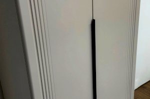 Корпус шкафа изготовлен из ЛДСП, что гарантирует прочность и долговечность. Фасад, покрытый МДФ в плёнке ПВХ, не только выглядит эстетично, но и защищает шкаф от повреждений. Особое внимание заслуживает фрезеровка фасадов, которая придаёт шкафу изысканный вид.