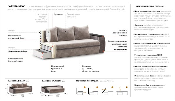Диван Атика (Империал) продается в интернет-магазине mebelin-dubna.ru по цене 69 362 руб. Есть доставка по Дубне и Московской области. Возможность подъема на этаж и сборки уточняйте у менеджера по телефону 8(800)505-27-11.